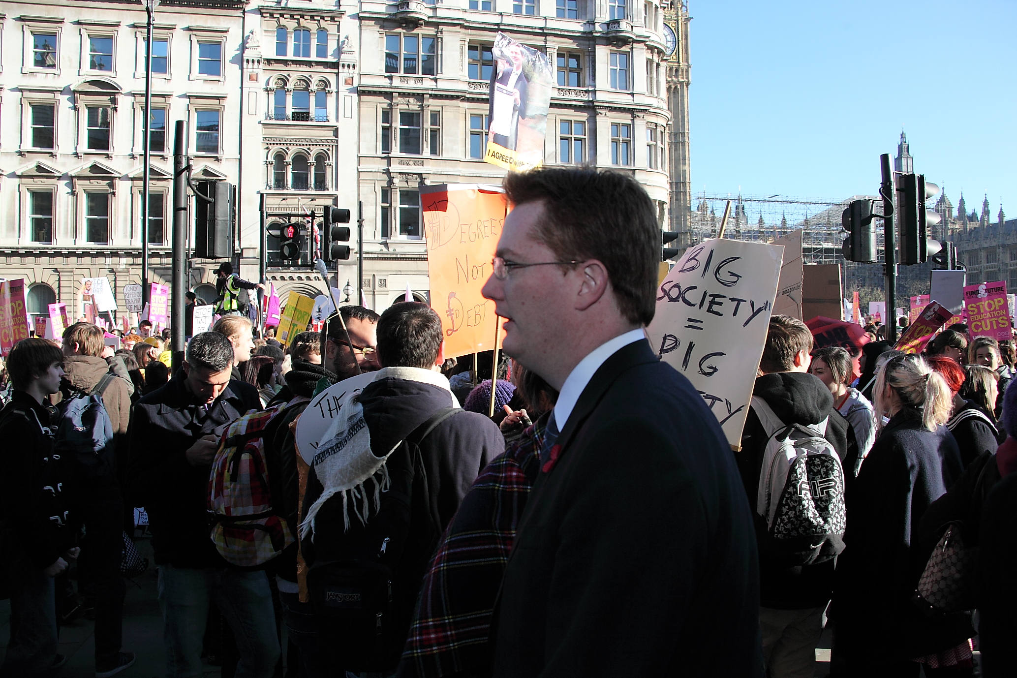 The students are protesting, and they want Clegg – he promised, and he has reneged on that in the most public way. He can’t make up his mind, the party are at war, his trusty Cable is giving mixed messages – they now want to defer the vote on 9 December 2010 because they can’t decide.