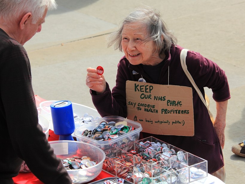 Thousands of pensioners rallied in Trafalgar Sq against the expected cuts in welfare service and public sector jobs. This old lady, activist, was buying a badge calling for us to "Smash the IMF". You are never too old. 10 April 2010