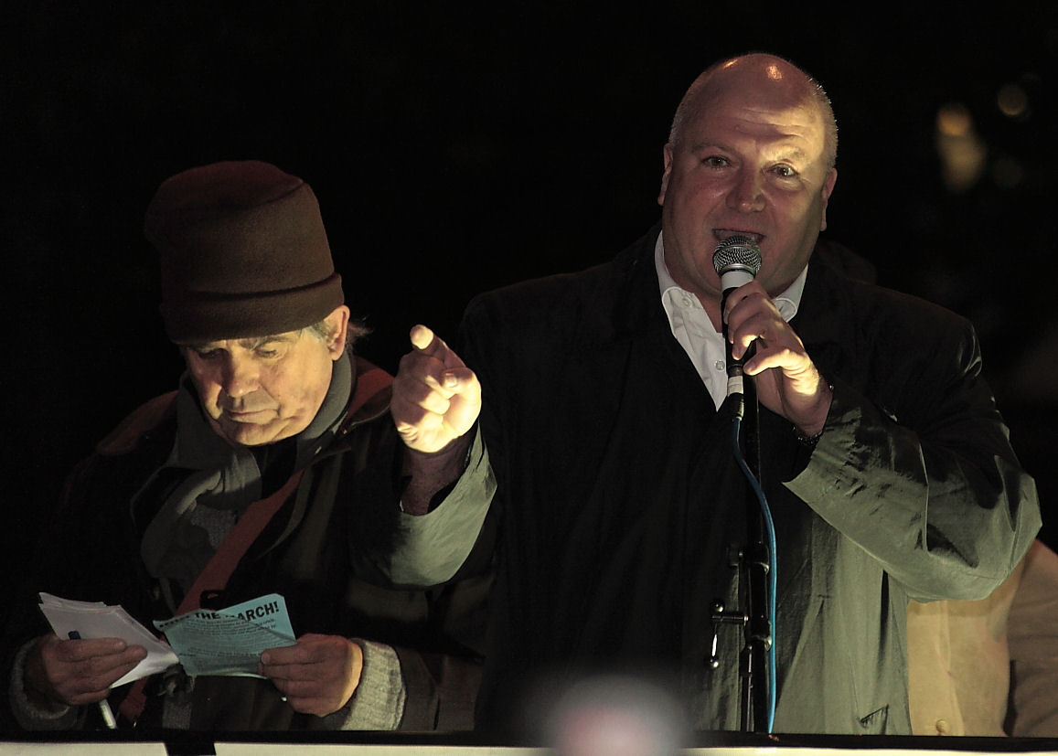 On the day of the Coalition's Comprehensive Spending Review which announced significant cuts to public spending, Bob Crow speaks to a rally in Whitehall - there is mention of a General Strike 20 October 2010