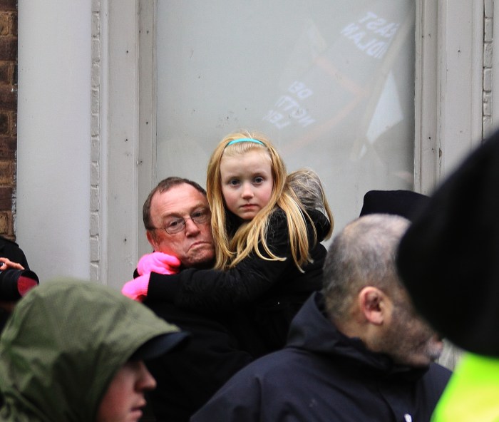 Father and daughter get caught up in the confrontation between the EDL and Police in Stoke town centre. One of the most violent EDL events this year. 23 January 2010.