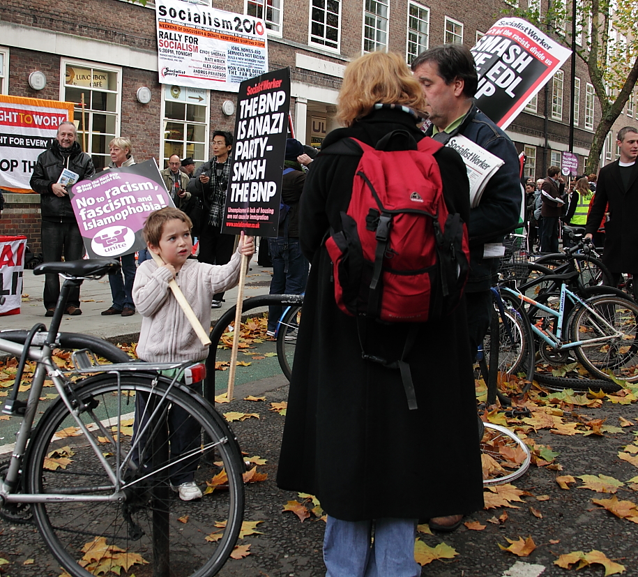 A family grouping gather their placards together as they embark on the demonstration against racism, and fascism. 6 November 2010