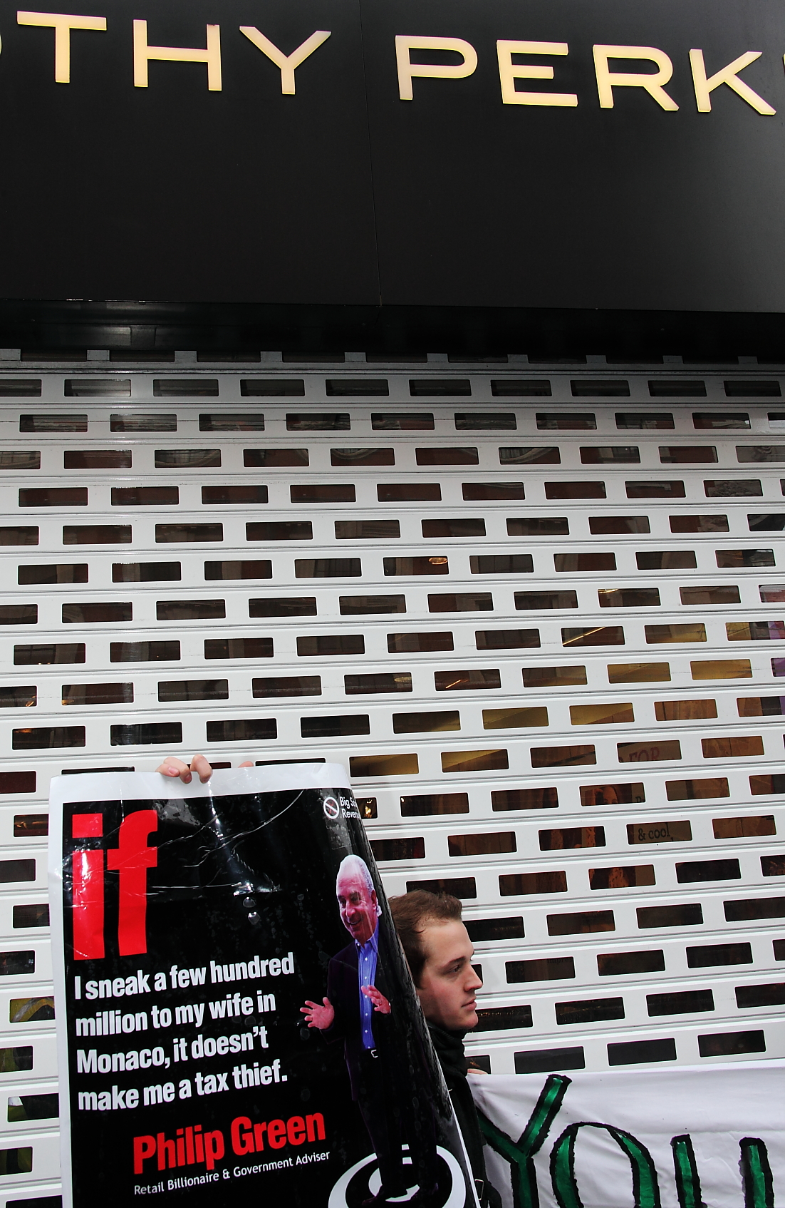 Protestor outside one of Sir Philip Green's flagship stores on Oxford Street.