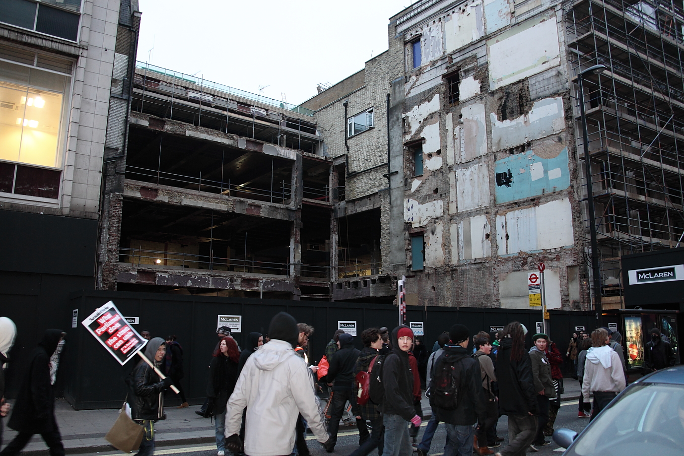 Bizarrely, the dwindling numbers made their way past Victoria to the Egyptian embassy in some sort of virtual solidarity with the Egyptian people; whose plight is a little more serious than a handful of kids with a loan for their tuition fees. After much standing around and setting alight to a few placards, the march formed up to go to Oxford Street. From this point on groups started dispersing, and walked randomly through the streets. The self-styled activists who, armed with a few bangers, and matches, couldn’t muster up much enthusiam to do anything consequential. They were vastly outnumbered by the shoppers and were a passing irrelevant piece of light entertainment, and in some cases, temporary annoyance.